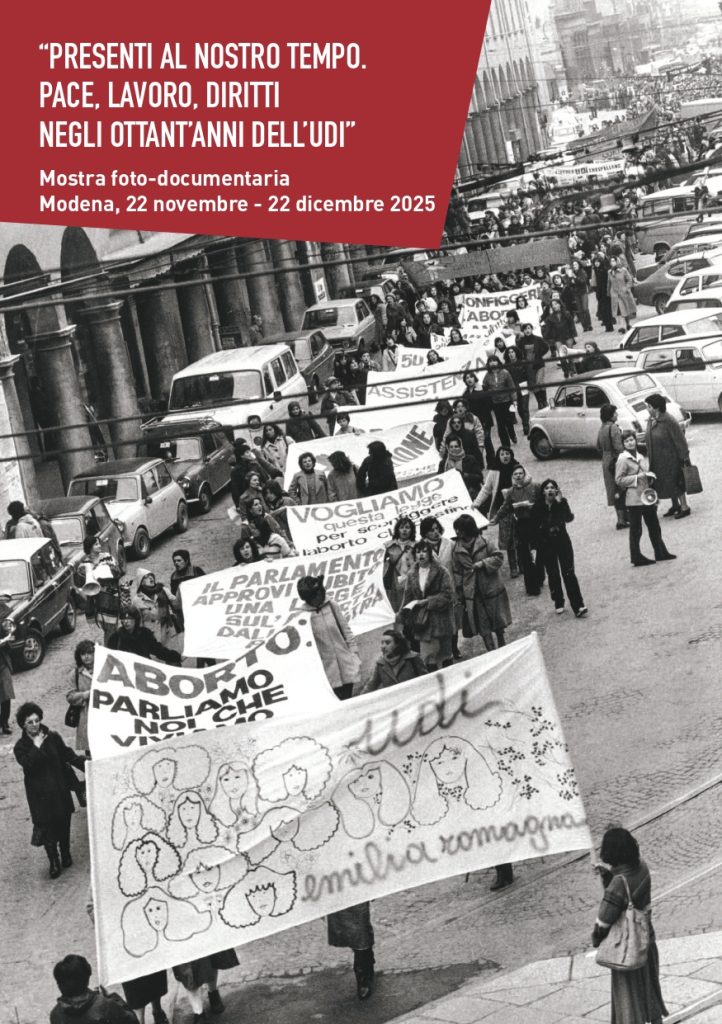 Sabato 22 novembre 2025, ore 10.00, presso la Sala Renata Bergonzoni (Casa delle Donne di Modena, strada Vaciglio nord 6) si terrà l’inaugurazione della mostra “Pace, lavoro, diritti negli Ottant’anni dell’UDI” in occasione dell’80°anniversario dell’UDI a cura di Eloisa Betti, Archivio UDI Bologna e Università di Padova, Caterina Liotti, Centro documentazione donna, e Laura Orlandini, Archivio UDI Ravenna.