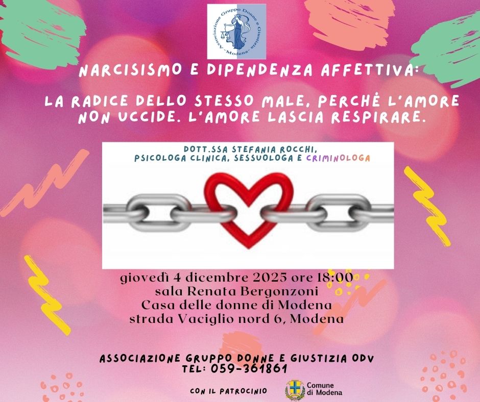 Giovedì 4 dicembre 2025 alle ore 18.00 presso la Sala Renata Bergonzoni, Casa delle Donne di Modena, si terrà l’incontro Narcisismo e dipendenza affettiva. La radice dello dello stesso male. Perchè l’amore non uccide, L’amore lascia respirare promosso da Associazione Gruppo Donne e Giustizia.