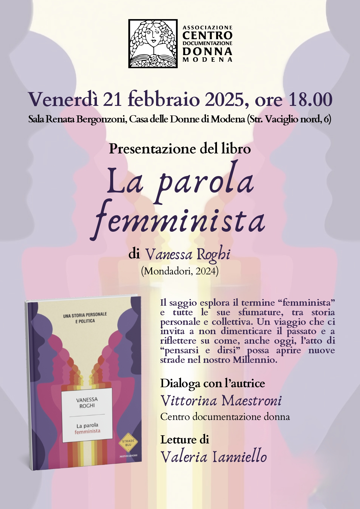 Venerdì 21 febbraio 2025, ore 18.00 presso la Sala Renata Bergonzoni, Casa delle Donne di Modena (Str. Vaciglio nord, 6) si terrà la presentazione del libro “La parola femminista” di Vanessa Roghi (Mondadori, 2024).