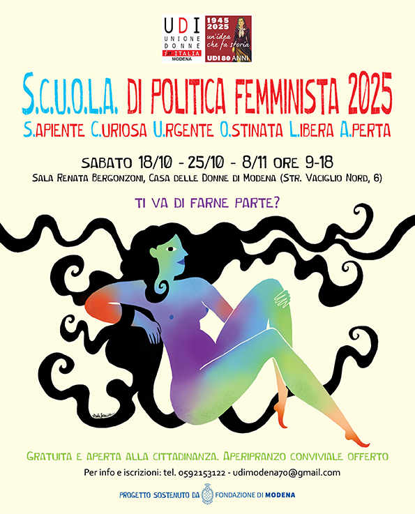 Dal 18 ottobre all’8 novembre 2025 si terrà, presso la Sala Renata Bergonzoni (Strada Vaciglio nord 6), la Scuola di Politica Femminista promossa e organizzata da UDI Modena per celebrare gli 80 anni dell’UDI: un’eredità di libertà e partecipazione che si rinnova nel presente.