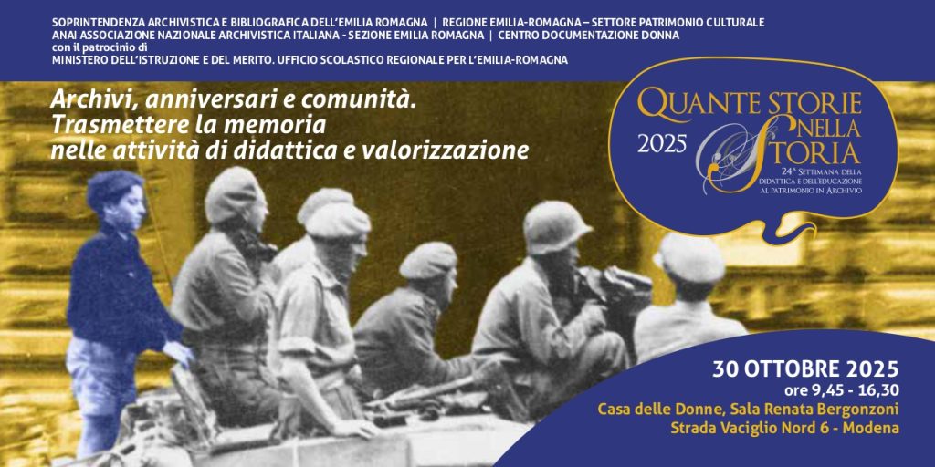 Giovedì 30 ottobre 2025, dalle 9.45 alle 16.30 presso la Sala Renata Bergonzoni – Casa delle donne di Modena (Strada Vaciglio Nord 6) si terrà il seminario “Archivi, anniversari e comunità. Trasmettere la memoria nelle attività di didattica e valorizzazione” promosso da Soprintendenza archivistica e bibliografica dell’Emilia Romagna, Regione Emilia-Romagna – Settore Patrimonio culturale, ANAI Associazione nazionale archivistica italiana – Sezione Emilia Romagna e Centro documentazione donna di Modena.